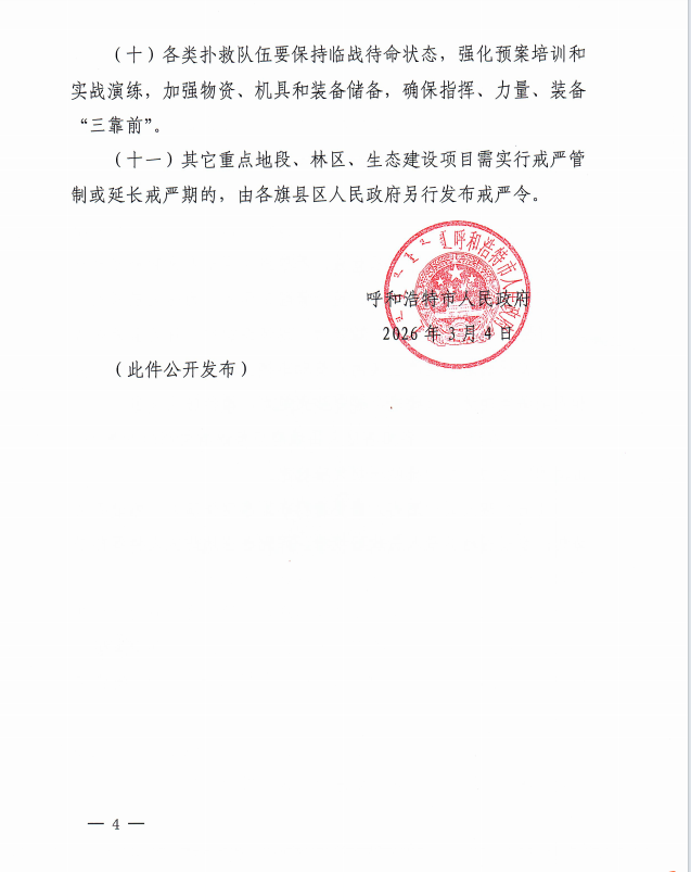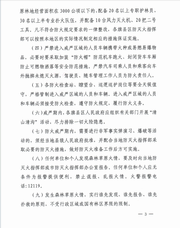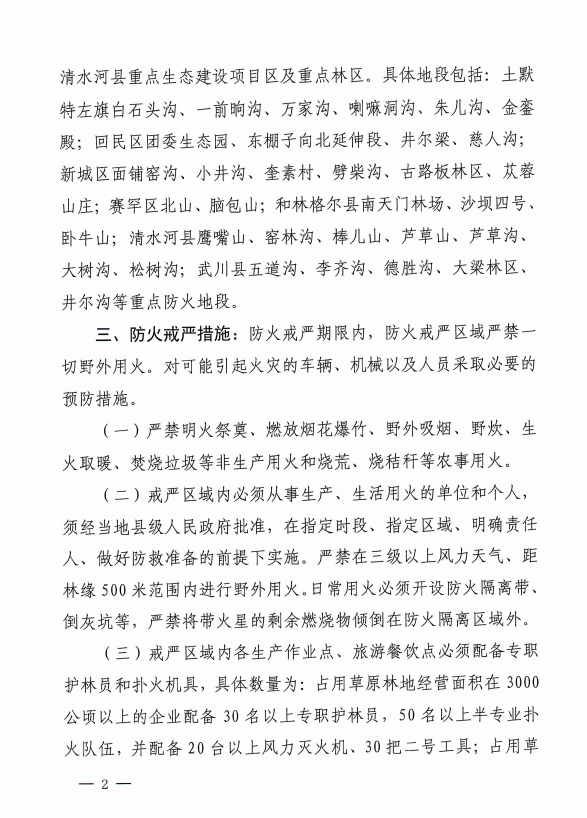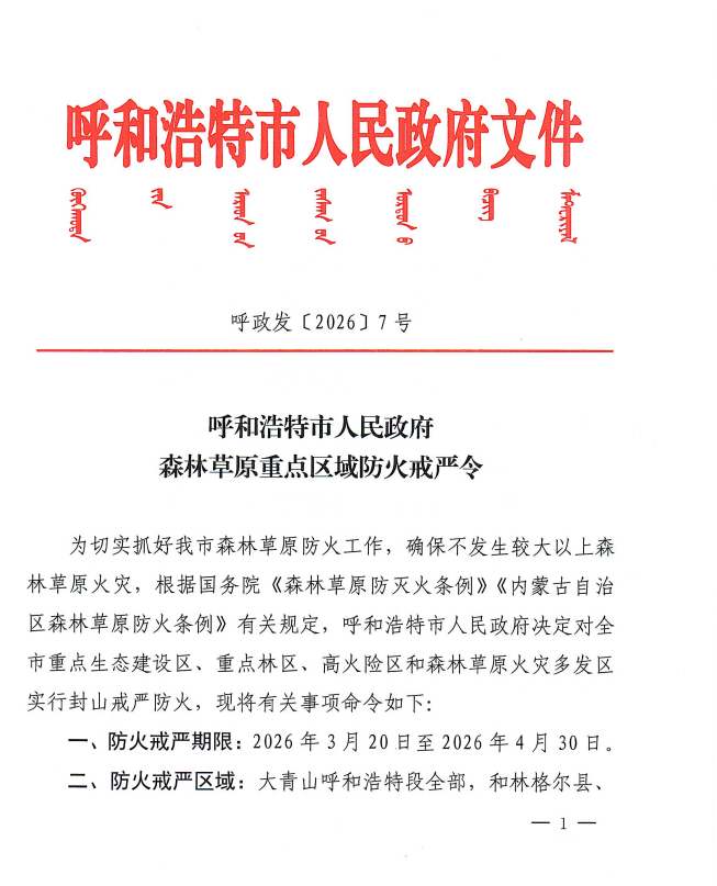 呼和浩特市人民政府森林草原重点区域防火戒严令
